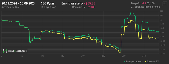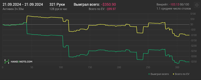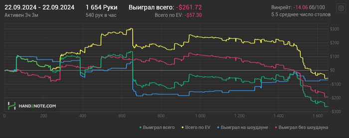 Играл на концентрации мало столов (просто не было много игры). На отметке 850 рук падение красной - сделал хороший фолд в дипах (разобрано).