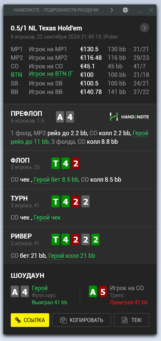 Потом зачилка и разбор своих раздач в визарде. Вывод по разбору: в паре раздач не оптимальный с точки зрения ГТО сайз подобрал, но все равно выиграл) И в паре раздач на айпокере ошибки. В одной перекол флоп и лишняя агра, во второй переагрил со флопа. В итоге наказан роботами айпокера