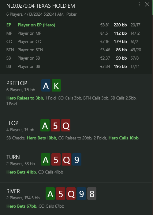 Меня эти шоты прям подкосили, причем не в финансовом плане, а в моральном. Я не понимаю как рег который бьет нл4 в 9бб на 100, может так ужасно отыгрывать верхние лимиты, что не так...
