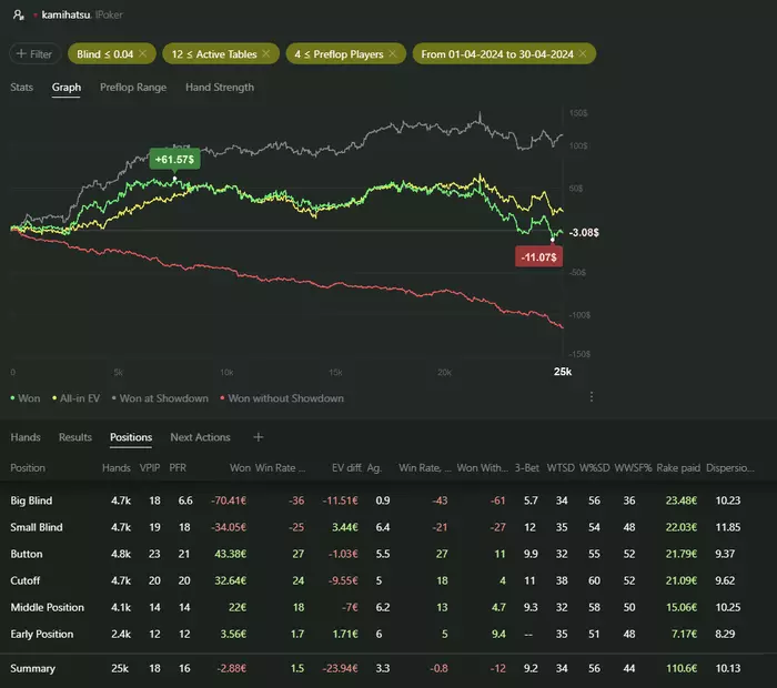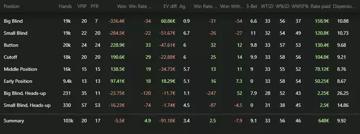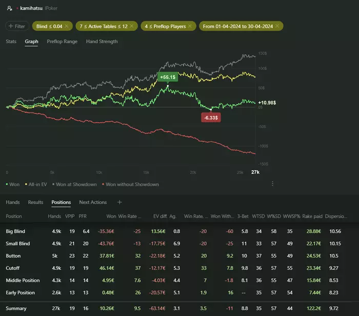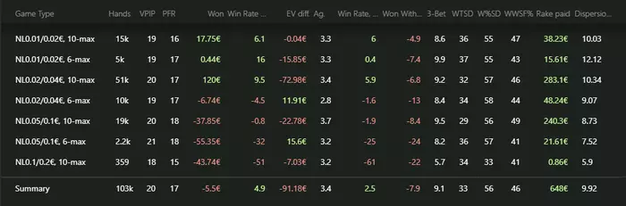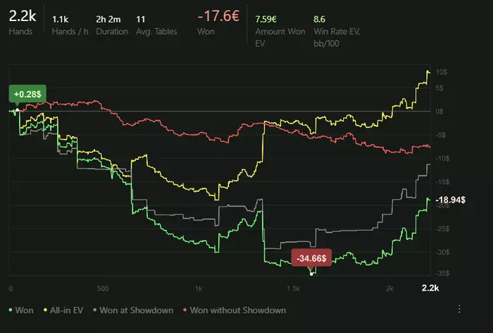 Игра от 7 до 12 столов с винрейтом в -11 бб на 100 но могу сказать что тут не добор и все не так плохо