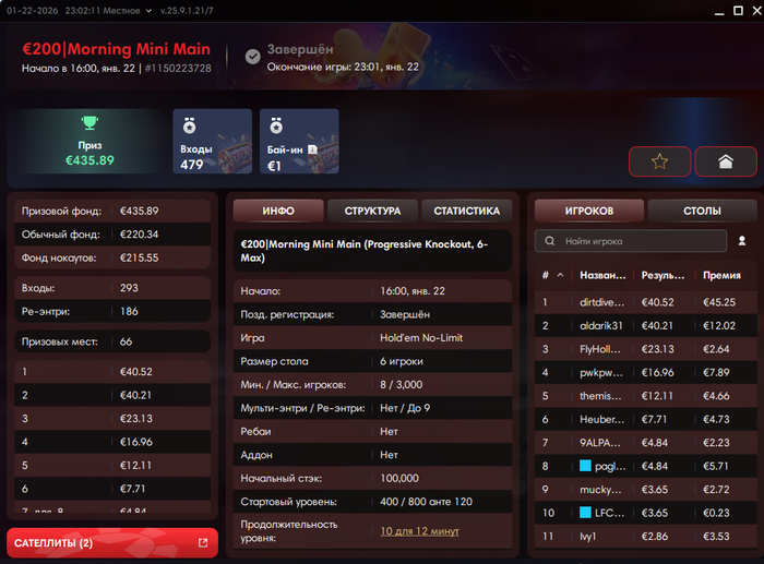 HrenVitya, на счет Покерка солидарен с твоим мнением, попробую поменять приоритет румов в загрузке. До этого грузил максимум турниров на Покерке и остальными румами догружал, сейчас попробую наоборот. Буду первым открывать ПД, далее уже WPN и оставшиеся слоты закрывать ПокерКом турнирами с хорошей структурой.