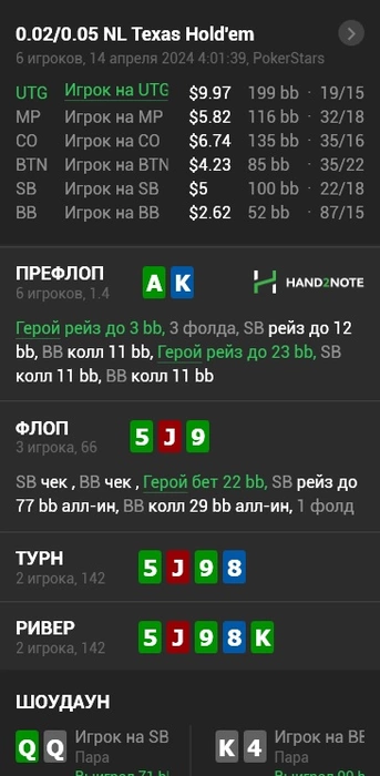 А еще хороший совет от меня для микро новичков, прекратите без позы колить 3б(это мазохизм)! Даже если рука вам кажется красивой! Лучше 4б-фолд сделать или просто фолд, сразу сдаться. В покере позиция это самое что есть ахуенно что можно иметь.