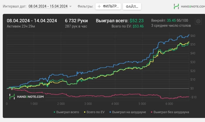 Накидаю отчетик для налоговой истории за последнюю неделю. Результаты, после применения советов гуру покера, не побоюсь этого словосочетания, весьма радуют и вдохновляют!!! Координально была изменена стратегия игры, однако в тактике хватает косяков, но стратегия несет успех!!!! Считаю, что блог сделал именно то, на что я даже не расчитывал. Люди, здесь обитающие, просто и доступно указали путь по которому следует двигаться. Спасибо всем, кто оставлял комментарии!!! и если я кого то зацепил своими ответами=прошу прощения!!! в вине споре рождается истина.