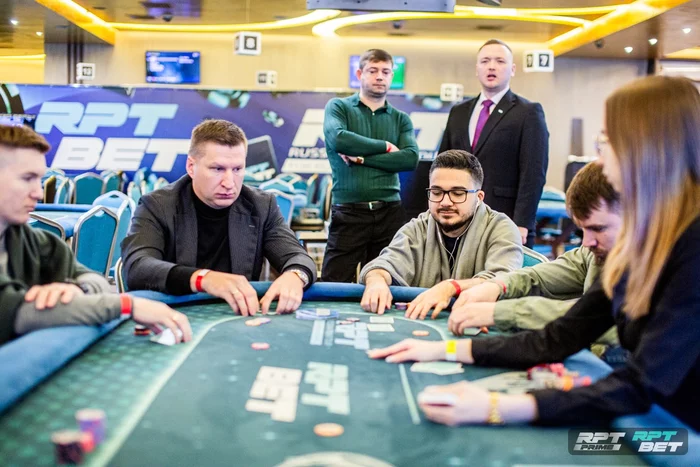 Участники финального дня уже разместились за столами. За первые 10 минут потеряли Арсена Гаспаряна, Константина Скручаева, Романа Алтыникова, Романа Караевского и Михаила Кетлерова.