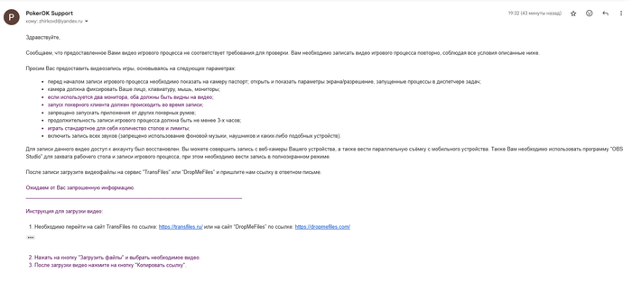 Всем привет! История такая же как у всех. Играю мтт микролимиты, заморозили 8 июня. Видео предоставил 8 июля. Аккаунту меньше года, депал через Luxon, был минизанос в серийнике за 5.5 в середине мая .Успел вывести средства через обменник до заморозки. До этого играл +/- в 0. Акк в плюсе на 2к.