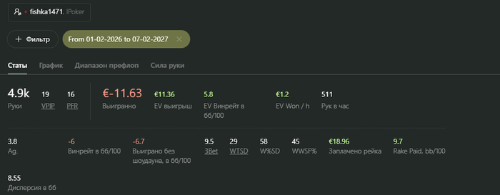 Пока яйца вертятся в тепле, немного проанализирую неделю игры. Стараюсь учить чарт гринлайна, принял во внимание урок от Kazrich, продолжаю на работе поглядывать 4ertik'a. Префлоп стал немного лузовее, но не достаточно.