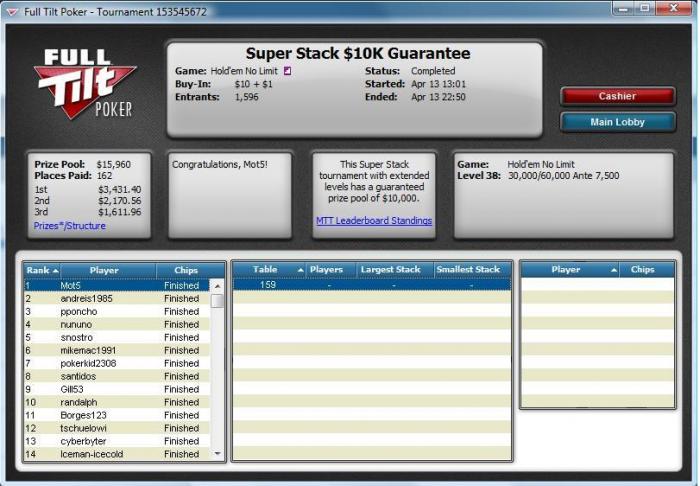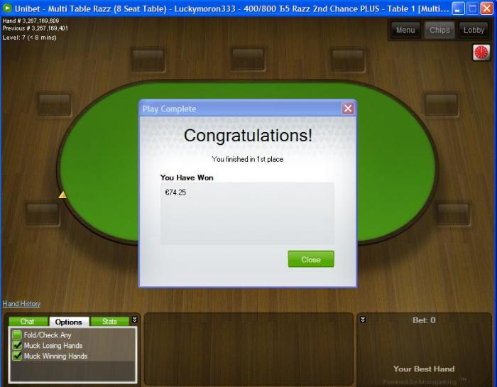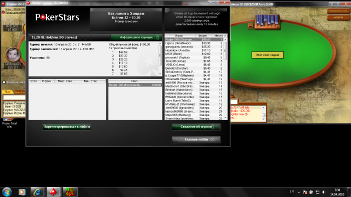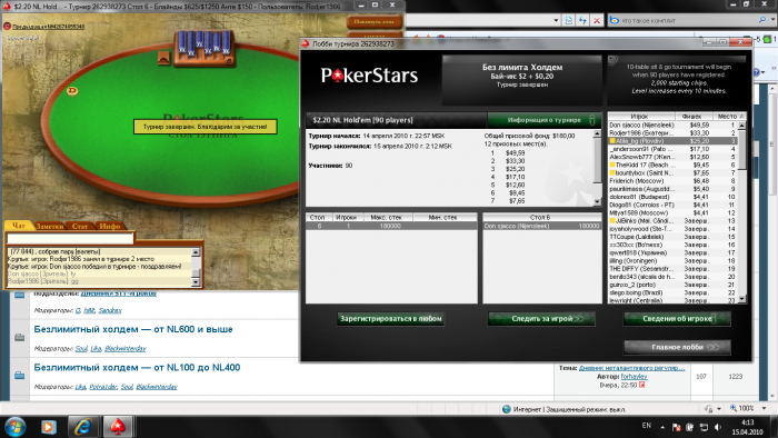 собсвеннно про турнир...первую часть отыграл отменно -уроки игры на низких блайндах (усвоены хорошо) после завершения ребаев-- засел чип лидером часа на 2!!! ближе к баблу немного покачивало из й10ки во 2ю:) финалку до Хед запа отыграл отменно) Когда оставалось 4 чела шёл с 50% фишек длительное время...и ждал Хедз-апа в позиции сверху...но 3 оппа ушли в оллын))) в итоге равные Стеки...маленький промах в начале...потеря лидерства...нервы ...и как итог 2е место!!!