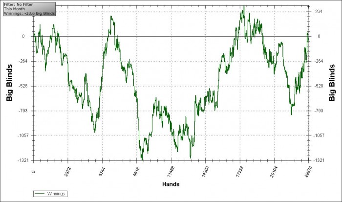Это снова микс лимитов, в деньгах в итоге вообще минус получился. Играл мало, плохо, надоедало быстро. Несколько дней вообще не мог собраться и сесть работать, накопилась усталось, и от покера тошнит местами. В начале месяца мотался в Литву из-за этого не мог войти в нормальный режим, в конце месяца все сложилось, но сломалось кресло, а по ночам их не продают, в результате до сих пор новое не купил и играю на стуле. Банкролл просел, что также добавляет приятных психологических аспектов. А результат сочетания этого раздолбайства и обстоятельств очень точно проиллюстрирован на графике. Лучшего итога сложно было ожидать, в общем-то, как я сейчас понимаю.
