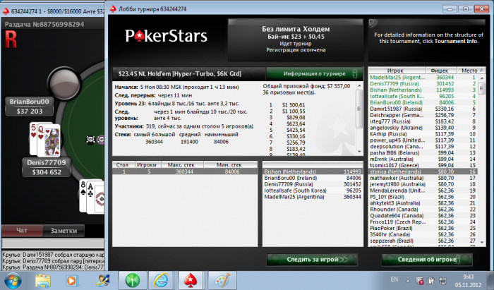 BB Damir151987 (11,184) 11bb Blinds: 500/1,000 Ante 100