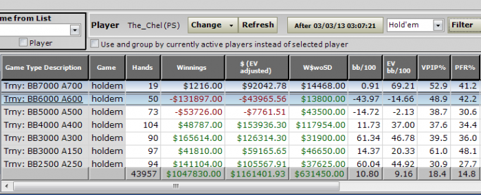 Мне вот странно что твоя игра приносила тебе раньше + а щас вдруг при той же игре все залил.Не могут же фиши прокачать так свой скилл))) Да и какой там скилл их там каждый день тоннами прибывает,а регов там не так уж и много. Кстати видел на этом лимите интересного персонажа с ником pokerbroufa за год почти 50к турниров с рои 5% и что интересно у меня на него 3к рук с нулевым процентом кон бета. тоесть он только пушит или принимает и при этом умудряется играть хоть и в маленький но плюс. как можно (а главное зачем?) задротить на этом лимите по 4к турниров в месяц для меня остается непостижимой тайной. Сдается мне это просто бот.