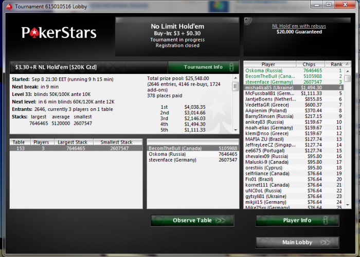 также буду плотно играть до 20-го, ну а потом принимаю парней на украинской земле. Сентябрь начался неплохо +2,3К, обидный недоезд вчера 8-е в 10+ на ПС, хотя на финалку вышел 2/9, а за первое 4К. Но все это мелочи, еще много таких шансов будет, так что гл нам.