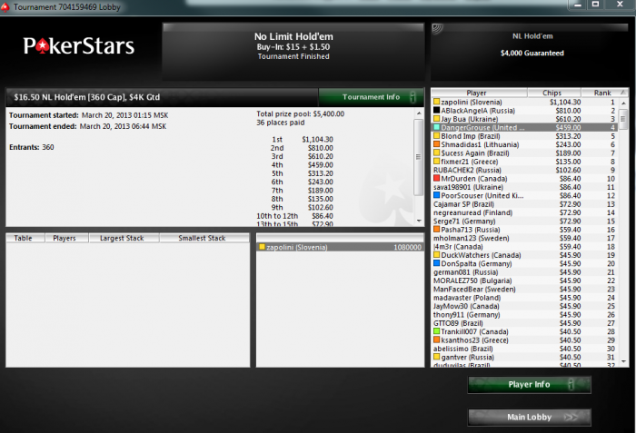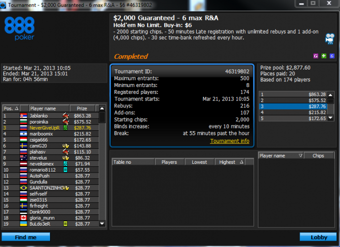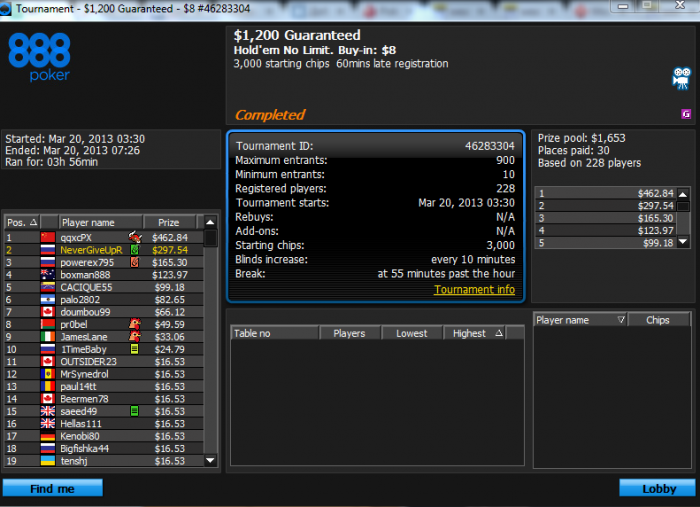 Одна из самых идиотских сессий в месяце - no comments. Дико устал, так что разбор оставлю завтрашнему дню. Из приятных событий топ-2 в ивенте за 11 на 888 и банк 70 долларов=) До конца месяца осталось совсем немного, а до платины еще далеко, так что придется серьезно выложиться в оставшиеся 9 дней.(статус необходим для покупки бонуса и кешаута, иначе меня с места бы этот статсус не сдвинул)