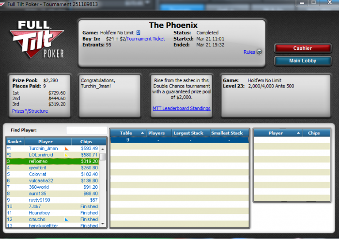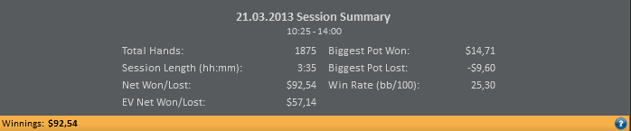 Вообщем как бы там ни складывалось, лимит я побью! Месяц почти на исходе, а третий полтинник как никогда рано в кармане, конечно не хайстейкс, но главное не сбавлять обороты. Из проблем: винрейт очевиднохромает, как и уровень игры в МТТ. Насчет последнего в корне поменял стратегию игры, статистика стала колебаться от 17-15 до 27-23 в зависимости от глубины стека и позиции на чрезмерно агрессивных оппонентов. + дорабатываю очевидные лики в пушфолде. Сегоднешняя сессия порадовала не результатом а именно качеством игры. Большиснтво проблем исходиили из мультитейблинга и так называемых инстарешений, принятых на автомате. В апреле жду прогресса от собственной игры по всем направлениям)