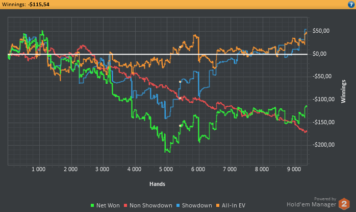 с момента поста творятся еще более нереальные вещи.. 4 разда сдали КК в АА и три сет в сет. Иду в минус 180 за тысячу двести рук и это абсолютный провал. Настолько абсолютного и безостановочного невезения я не помнюl. Что бы ни случилось здесь и сейчас, для меня это полнейший шок и убийство целого месяца работы.