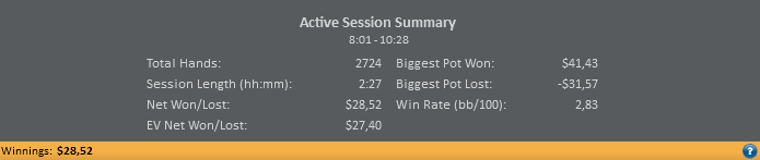 Параллельно оставшемуся столу тихо-мирно играл небольшую сессию в кеш, результатами которой в целом не могу быть не доволен. Вот несколько действий, которые постепенно осваиваю: