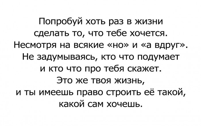 У вас одна жизнь. Она происходит прямо здесь и сейчас. Живите так, как хотите, слушайте свой внутренний голос и не позволяйте