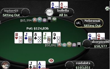 Hero shows J Q (two pair, Queens and Jacks)