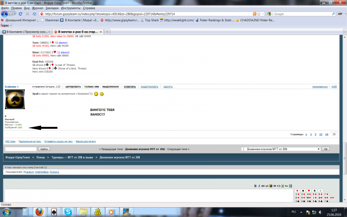 Стартовал как обычно с 75 нокаута на ФТП, сразу попал за стол к нсмирнову и еще 5 русским, как обычно сразу аут с АА. Каждый день в этом турнире я укладываюсь за 10 минут =))