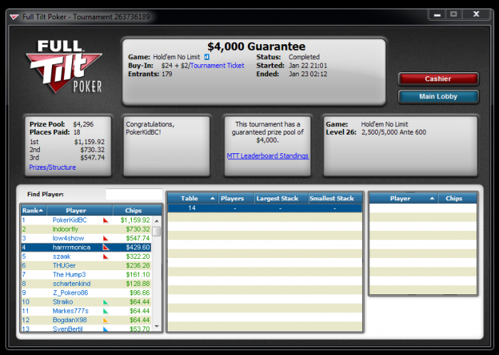 Full Tilt, 200/400 blinds, 50 ante No Limit Hold'em Tournament, 8 Players