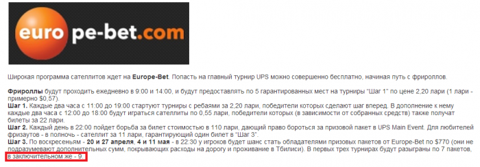 EUROPEBET @ 5.5.2014 Спасибо за комментарий. Условия не менялись, на самом деле на этой неделе действительно разыгрываются 9 билетов, а не 7, как вы заметили. Сегодня вечером это будет изменено также технически. Так что приглашаем всех попробовать свои силы в недельном финале и приехать на серию в Тбилиси через менее чем 2 недели.