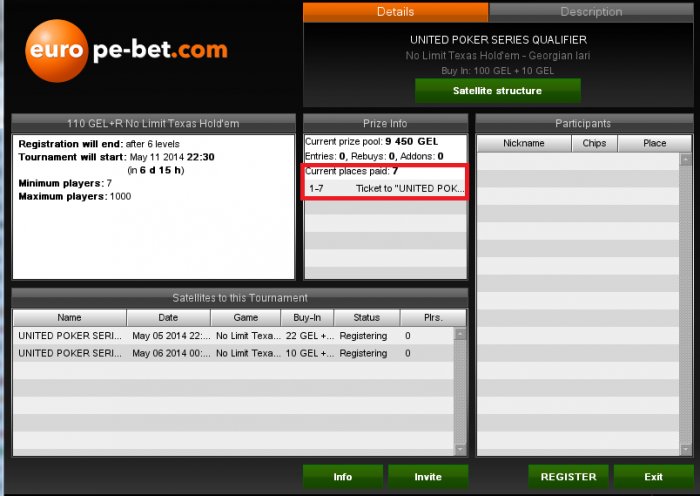 Сегодня вечером не пропускайте финал недели на Europe-bet.com - 7 мест гарантировано на Main Event Day 1A $150,000 GTD. Начало в 22:30 по Москве, бай-ин 100+10 лари ($56 + $5.6). 14 человек имеют уже путевки, еще минимум 7 определятся сегодня!