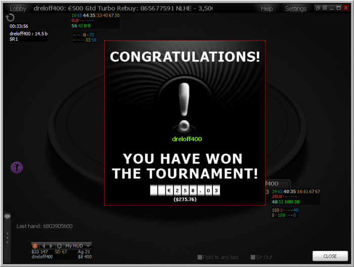 Так и сделал. И это вышла самая эффективная из когда-либо сыгранных мною сессий. Состояла она ровно из трех турниров на Титане: Warm-up за 50, фриз за10 и ребайник за 5 евро. В самом дорогом турнире вылетел без призов, но из остальных выжал максимум