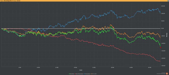 Я постоянно разбираю крупные банки: выигрыши и проигрыши, и прекрасно знаю, где заливаю: минусовые куллера, переезды, "Хуй с ним коллы потому, что не может быть, что ему опять доехало явно не по шансам банка", дисциплинированные пасы. Тузов убивают напрочь либо забираю блайнды, с королями такая же хуйня. С АК, попав в А или К на флопе ничего не собираю, ноль. Когда карманы попадают в сэт, то я либо выбрасываю, т.к. ривером приезжает флэш, либо не выигрываю ничего! А, как в сессии видели, ещё старшие сэты на флопе убивают переездом натсовые сэты. Блять, вот и вся игра. И ничего с этим я не могу поделать, физически. А БР каждый раз все заливается и заливается. Ну, и как следствие, только по ЕВ недобор составляет 56 баксов, что для НЛ2 многовато, даже для дипов (там байин 2, 4 или 5).