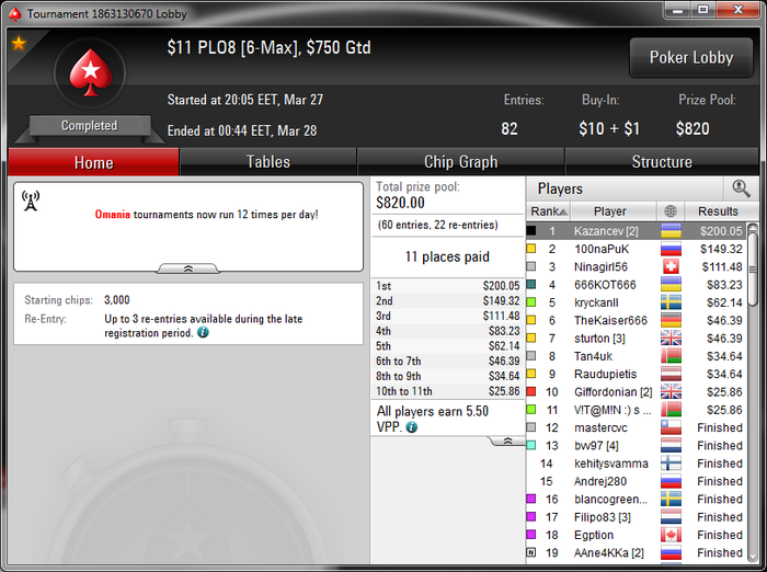 Продолжаем офф: Турнир гарантия 2к уе (будет около 3к), вчера первый день би 30уе (800 грн)