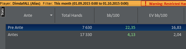 Подводя итоги сентября, хочу заметить, что одна из целей - поднять винрейты преантэ завершилась успешно. Правда, Пост анте немного уныло теперь выглядит, но тому есть обяснение. К примеру, возьмем вчерашний день. Вылетел из 16 турниров. 6 раз из них ошибся (Это пипец как много), 8 кулеров - тоже не мало. Евшка получилась слабая.