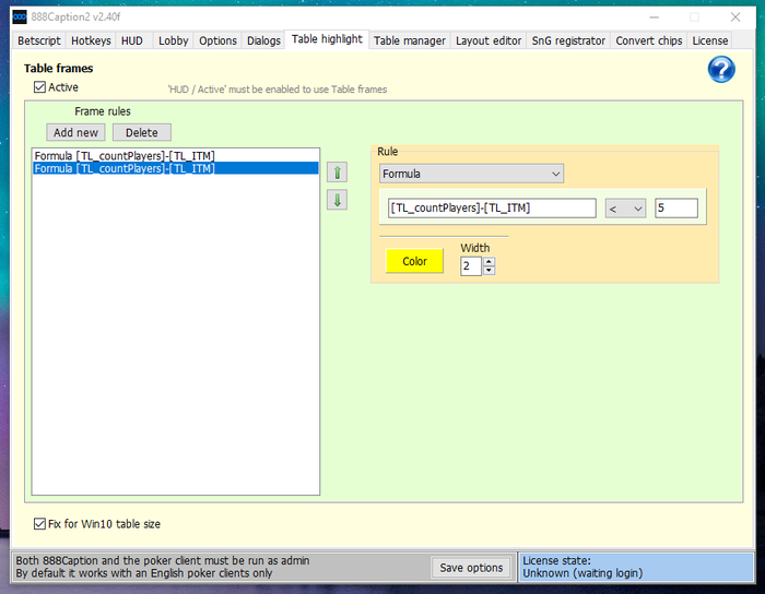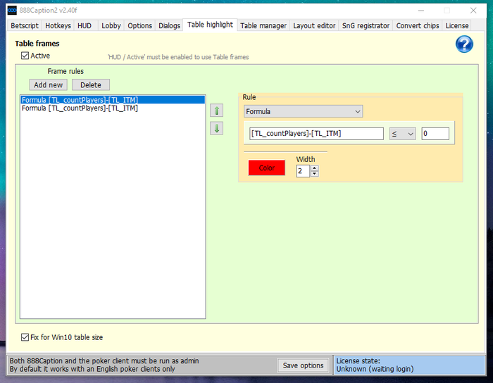 1. Добавил Observed table, Sitout, Waiting to play, Hand folded в Table highlight, теперь можно делать подсветку стола по этим правилам. Observed table - стол без хиро Sitout - хиро в ситауте Waiting to play - хиро ждёт начала игры (ждёт бб / когда кто-нибудь подсядет за стол / начала турнира). Hand folded - хиро сфолдил в текущей раздаче