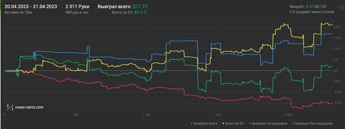 21.04.2023: 4.55ч, 2311 рук nl25/50 +$51