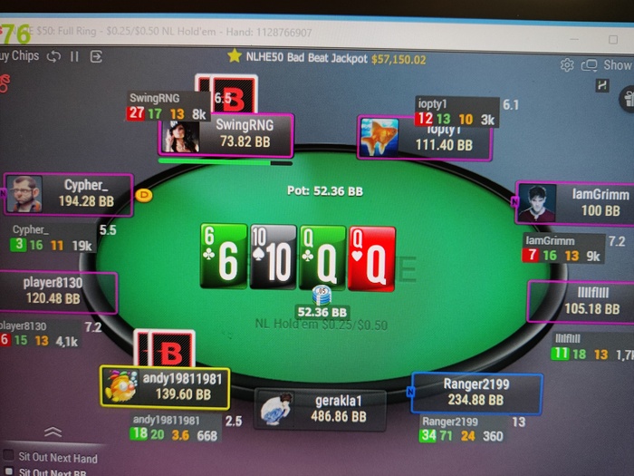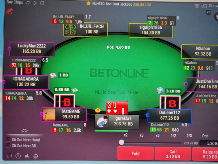 А мой вчерашний знакомый сегодня тоже играл, сел за стол со 100бб, не прошло и два круга, как у него уже 400бб стало, и он свалил сразу, на 700 рук он +30бб/100 играет 🤣