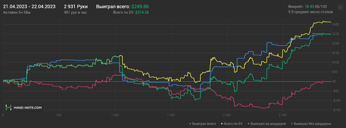 22.04.2023: 5.58ч, 2931 рук nl50 +$392.