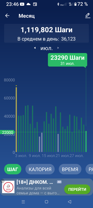 В итоге, благодаря всем вам похудел приблизительно на 6.5 кг за июль (подозреваю, что при правильном питании этот результат был бы внушительнее).Так что каждый из вас смело может записывать +1 в список добрых дел! Вписываюсь на август тоже, но там рекордов ставить не планирую: 10 000 шагов/день должны показаться лёгкой прогулкой после такого июля.