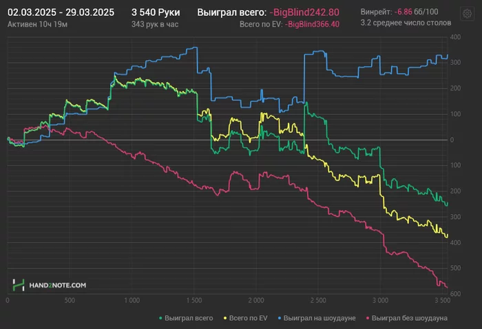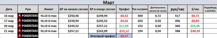 Вторую неделю марта провёл в небольшой минус. Играл чуть больше, но одна откровенно слабая сессия всё подпортила.