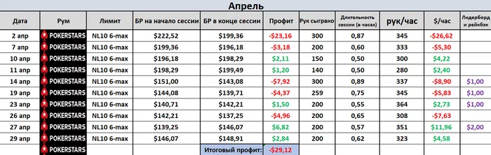 Из сказанного выше следует совсем небольшой, даже для меня, наигрыш в апреле. Да и в общем играл плохо, видимо нужно было вообще сделать паузу на месяц, так как голова была забита совсем другим.