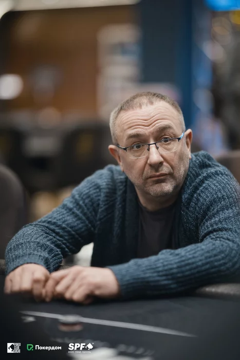 Стол 1. Вячеслав Кардаш (27,500) запушил блайнд на блайнд, Леонид Орман (220,000) уравнял с .