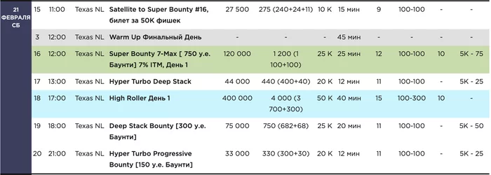 В 12:00 начнется двухдневный Super Bounty [750 у.е. баунти] с бай-ином 1,200 у.е. и уровнями по 25 минут. В первый день сыграют десять уровней, регистрация будет открыта 12 уровней.