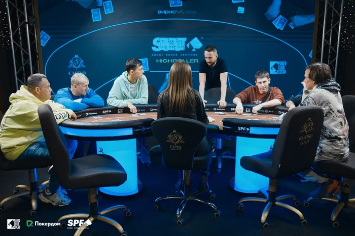 На прямом баббле Евгений Ольвинский "выживал" с самым коротким стеком, но тут случился тройной префлоп олл-ин, в котором Максим Луговской с и Вадим Конушин с не смогли обыграть чиплидера Евгения Семенца. На флопе открыли валета, и баббл лопнул.