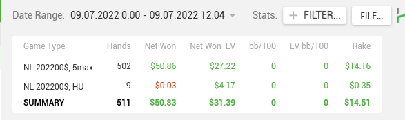 что то тут явно не так. За 500 рук НЛ10, даже если взять 30бб/100 рейк, у тебя все равно должен быть +35$. Ты скорее всего брал по ЕВ в раздачах или кассу не верно посчитал после сессии