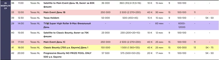 Обратите внимание на крайнюю правую колонку в таблице расписания. В ней указано, в каких турнирах со старта можно взять добавку к стеку "за чай": за 25-150 у.е. чаевых персоналу во многих турнирах можно получить дополнительные 5,000 фишек к стеку.