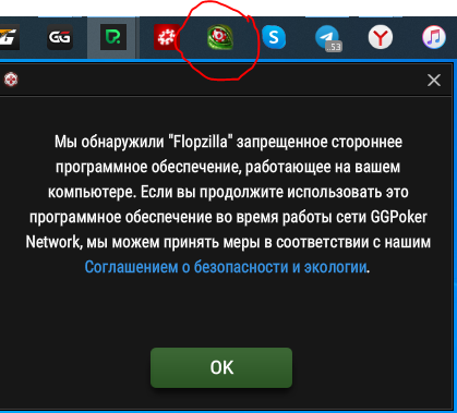 Сегодня клиент рума выдал предупреждение о том, что у меня запущена Flopzilla во время работы клиента GGpoker. Это предупреждение - ошибка. Flopzilla запущена НЕ была и не запускалась никогда параллельно с открытым клиентом рума, с правилами рума ознакомлен. Просьба подсказать, как быть в данный ситуации? Предполагаю, раз у меня без причины появилось такое предупреждение, то меня в ближайшем времени могут заблочить что ли без причины и ничего не докажешь?