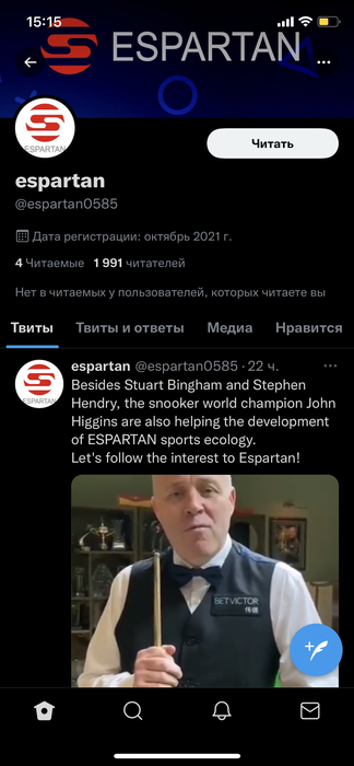 Ха, старички решили порекламить блокчейн, того же Трампа или Лисовки сложно было бы кинуть на этом, вот старину Хигинса и Хендри с легкостью можно провести и они будут пиарить все что угодно. Зашел на сайт, еспартан якобы позиционируют себя как крупной компанией, а внизу сайта ссылка на телеграм та еще команда на сайте не внушает доверие, видно развод ориентирован на 40+, за этого и они выбрали Хигинса и Хендри для рекламы в своей возрастной категории, а не молодых снукеристов. И как же без фейковых постов в твитере, десятки человек зарегались недавно, что сказать это cool.