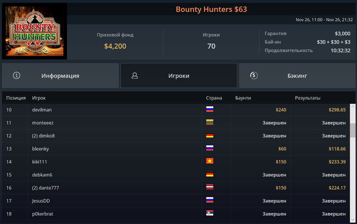 1. Bounty Hunters $63 Всем игрокам, принявшим участие в турнире, произведен перерасчет. В призах – 3-е наших игроков, в отношении которых произведен перерасчет и доплаты в размере: devilman $51,02 botir1210 $2,89 bleenky $2,89