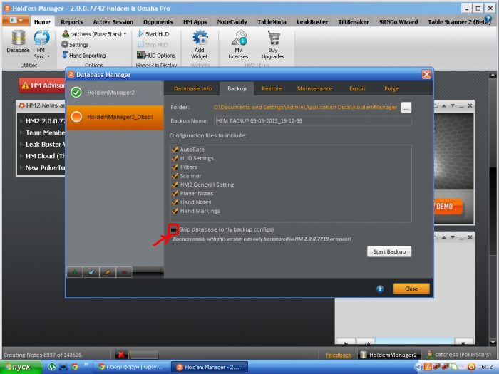 Подскажите пожалуйста.Я переустановил ХМ2 после чего выскочила надпись об обновлении базы данных.Я ее обновил и потом вылезла такая запись: The database update operation has completed sucessfully. The original database has been renamed to "HoldemManager2_Obsolete".Once you have verified the updated database you should backup and delete the renamed database. HoldemManager will restart now to complete the update. Вопрос:резервную копию какой базы данных нужно сделать(исходной или переименованной)?По размеру в мб переименованная база больше начальной. И нужно ли ставит галочку здесь при копировании?: