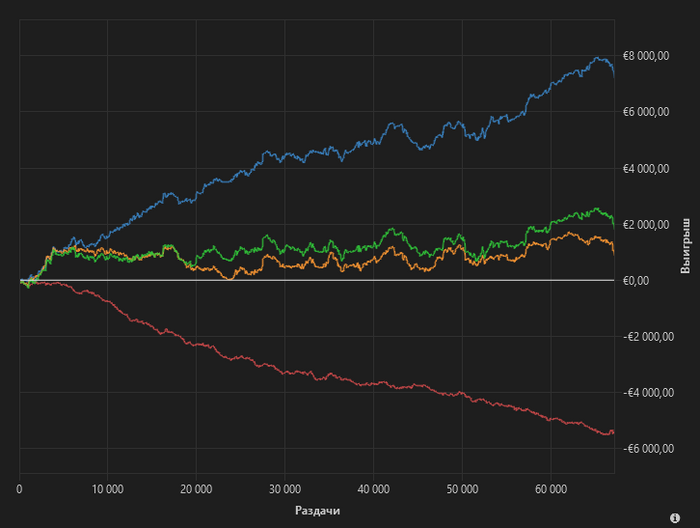 в 1.5ev bb/100, дистанция пока неочём, но в целом, печально пока что выступаю)) Дышу за счёт перебора. Приходится играть какое-то термоядерное количество рег варов, набирать игру через прыжки под R это не моё. Хотя был какой-то день когда я решил попробовать, но пинг настолько конченный, что это супер бестолковое занятие. Отбросил эту идею) Как бы людям, кто играет как я через фул тейбл старт - это не мешает винрейты показывать нормальные, так что тут сугубо во мне проблема)
