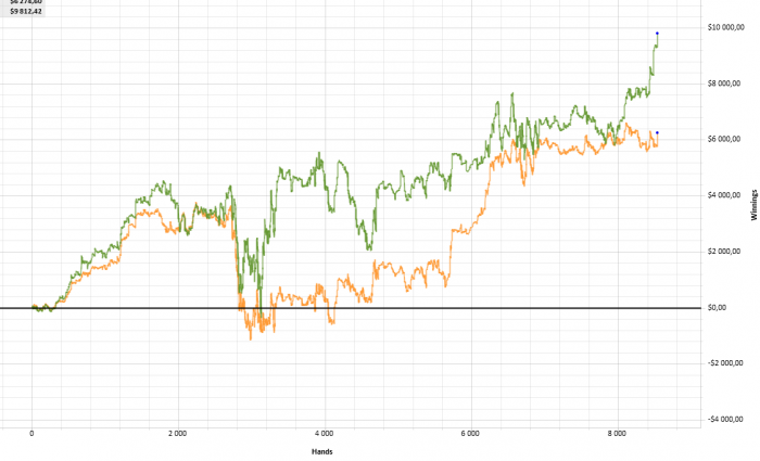 Против этого диапазон (добавляем любую пару) мы имеем 58% на флопе и монетку на терне, соответственно, пуш обязателен. Он сильноплюсовый, хотя казался убыточным - вот такая вот математика, мда