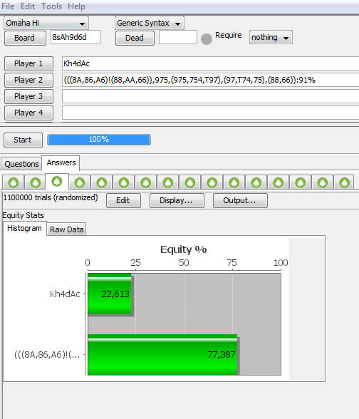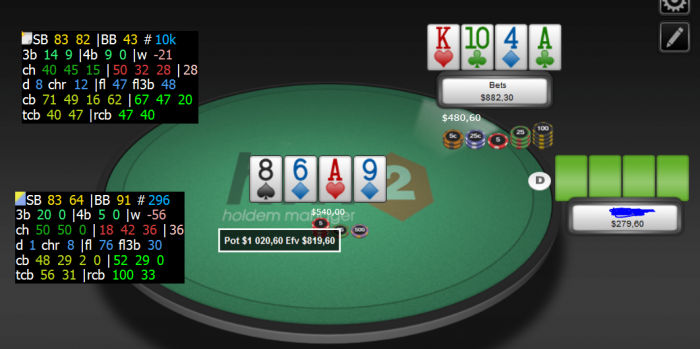 Это при том, что я считал, перепутав значения кола и фолда на флопе, т.к. у оппонента реально 29% не кола, а фолда, соответственно - 71% колл.