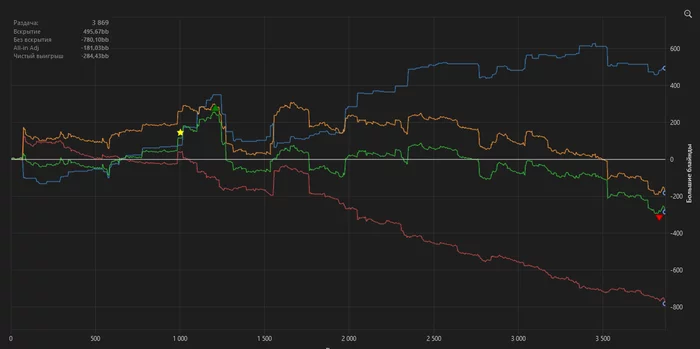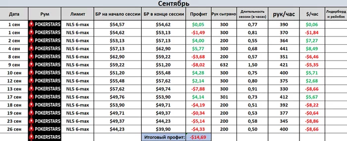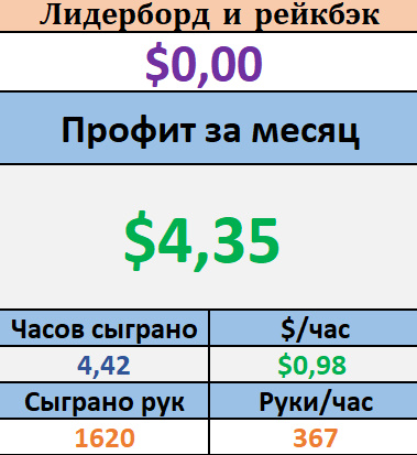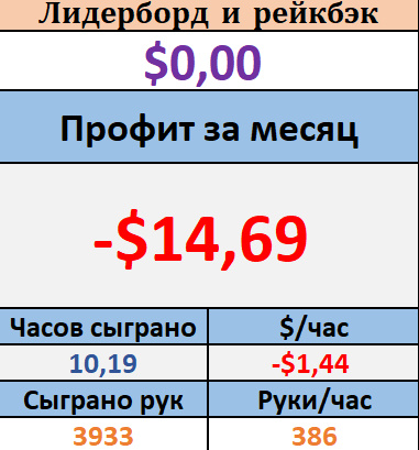 А я.. Я всё так же не бью микролимитный кэш , точнее НЛ5. Отыграл месяц в минус, правда была возможность вернуть в БР небольшую сумму ранее выведенных средств. Много выставлений сверху проиграл, порой играл из рук вон плохо.