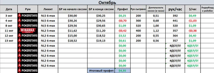 Покера в октябре было совсем мало, даже по моим меркам. Был вывод всего БРа со Старзов, проба НЛ2 на Winamax, и возвращение на PokerStars на НЛ2. Решил немного "перезагрузиться" в плане покера. Ближе к концу месяца провели треню с Mike8080. Получил кучу новой инфы, которую нужно "переварить" и внедрить в игру.